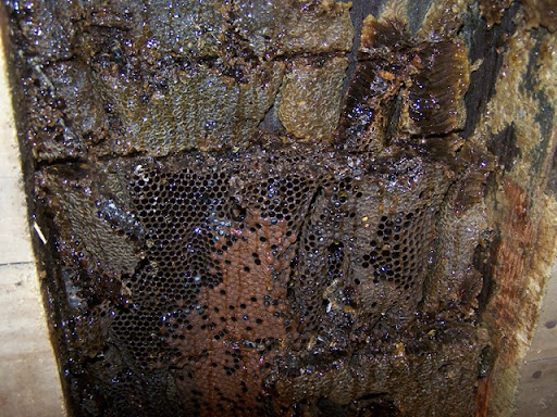 You'll receive calls from friend and neighbors asking you to remove hives from various kinds of structures and if you notice in the image above, you see very few bees. That's because we manufacture a specially made bee-vac that vacuums the bees safely into a cage. Otherwise, there would be thousands upon thousands of bees flying around protecting and defending the brood and honey in the picture. The brood is toward the center of the pictures, toward the lower left. It is a bit lighter in color, a leather brown color. Sealed honey can be noticed at the top of the picture. If you'd like to inquire about one of our bee-vacs click here